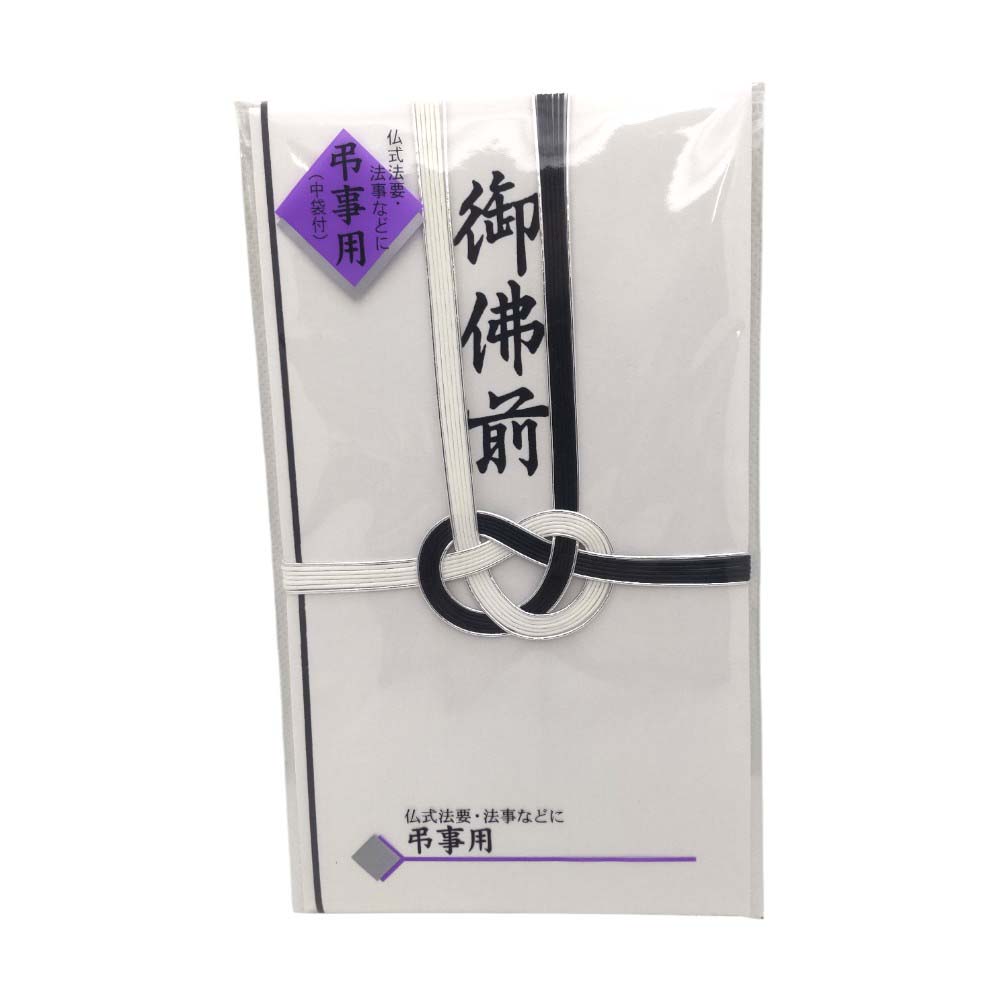 仏式法要・法事の金包みとして最適な金封です。蓮葉なしのタイプで、黒白水引の両端に銀色の水引を使用した7本あわじ結びの水引飾りが特徴です。「御佛前」の文字が墨色で印刷されており、一般的に49日から使用されます。